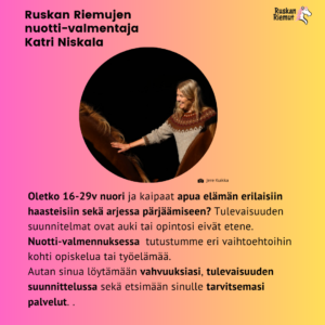 Ruskan Riemujen 5 kk Nuotti-valmennuksessa autan sinua tunnistamaan vahvuutesi ja rakennamme vahvempaa itsetuntoa. Pohdimme tulevaisuuden suunnitelmia ja ammatillista polkuasi ja..