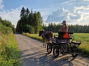 Olemme ottaneet uusia juttuja haltuun – valjakkovaunuilla ajelu on kivaa! Kukkahame päälle ja lierihattu päähän, tai onnistuu toppahousuissa ja ratsastuskypärässäkin…